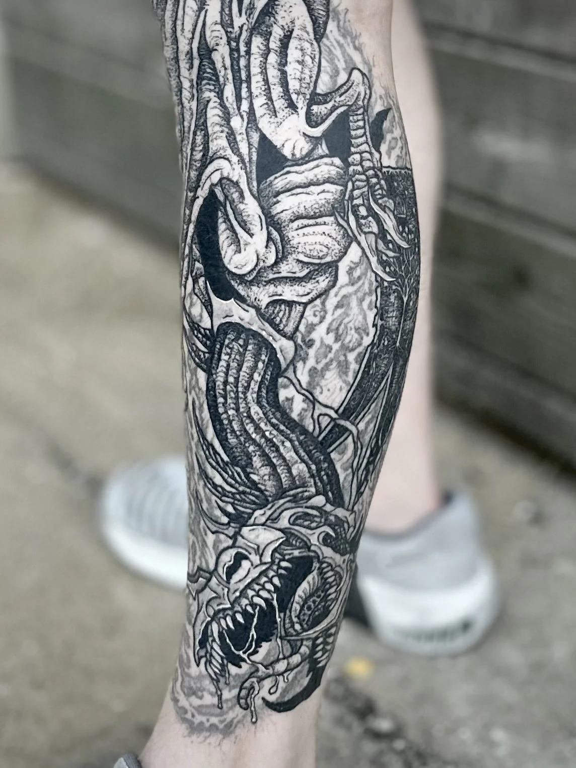 The Fellbeast is a custom example of Tattoo work completed by Noah Durany. This piece was specifically designed for this client. Appointments can be booked in the “Appointments” tab!